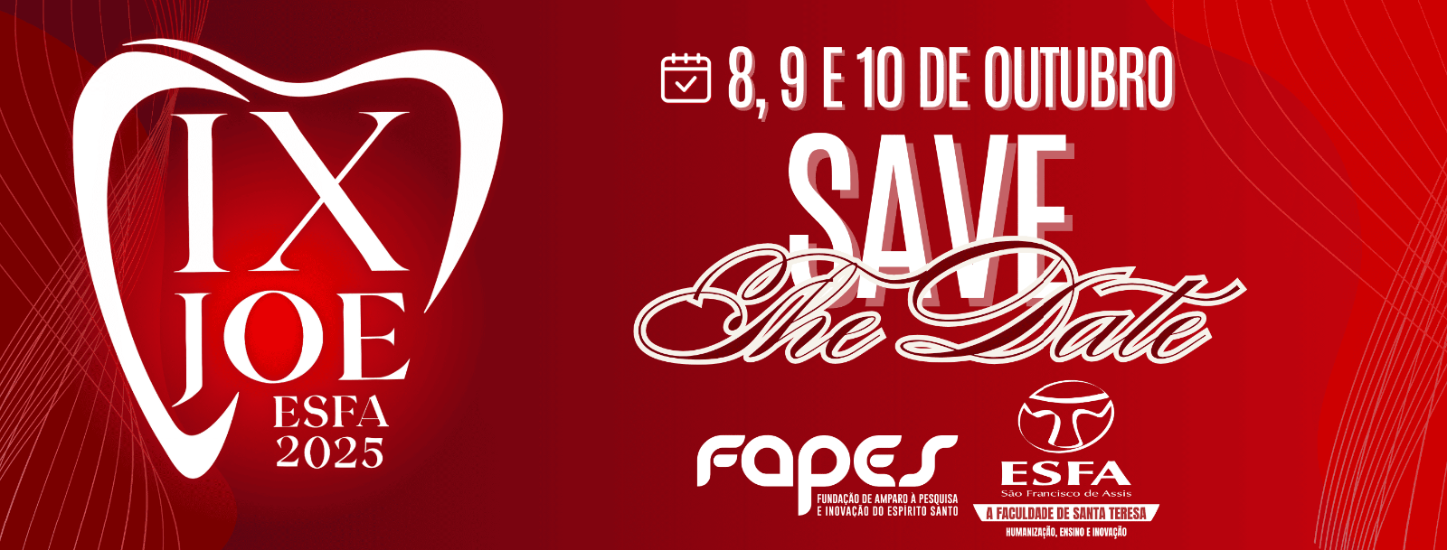 A Faculdade de Santa Teresa (ESFA) realiza, nos dias 08, 09 e 10 de outubro de 2025, a IX Jornada Odontológica da ESFA (JOE). O evento será realizado no Cerimonial da instituição e reunirá estudantes, egressos, profissionais e especialistas renomados da Odontologia, trazendo o que há de mais atual e inovador na área.