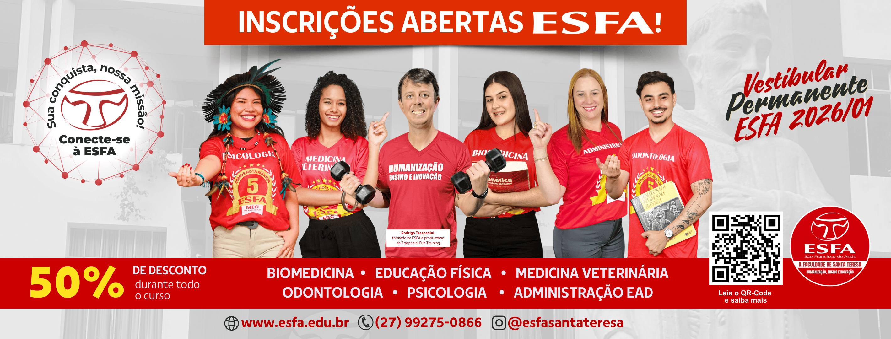 O Vestibular Permanente ESFA 2026/01 já começou. Esta é a sua oportunidade de transformar o seu futuro com um ensino de qualidade, metodologia premiada e um ambiente acolhedor em Santa Teresa–ES.