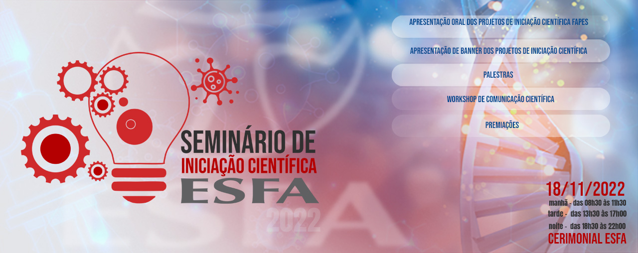 A ESFA realizará, no dia 07 de novembro de 2025 (sexta-feira), das 08h às 18h, o Seminário de Iniciação Científica 2025, com o apoio da FAPES.