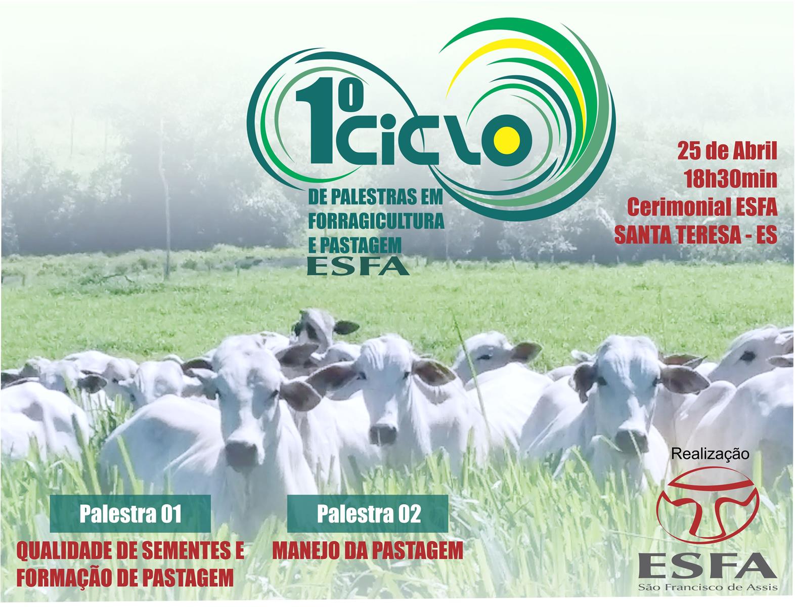 O curso de Medicina veterinária ESFA, tem orgulho de apresentar mais um momento de conhecimento, o Primeiro Ciclo de Palestras em Forragicultura e Pastagem da ESFA. Esse ciclo terá na sua programação duas palestras que apresentarão o que há de mais contemporâneo nas áreas de Qualidade de Sementes e Formação e Manejo de Pastagem.