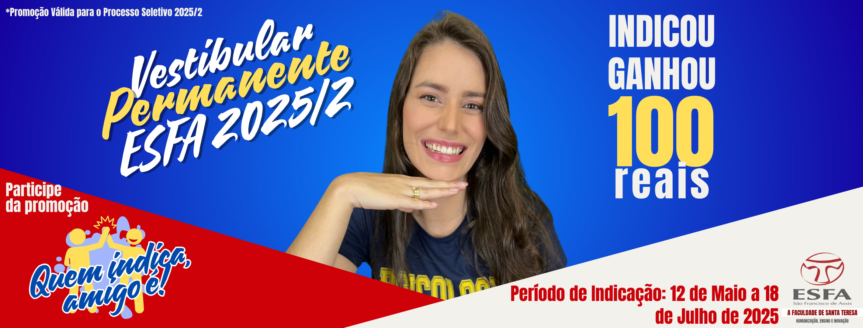 Indique um amigo para os cursos de Graduação da ESFA 2025/2. Cada matrícula efetivada por sua indicação vale R$100 diretamente para você!