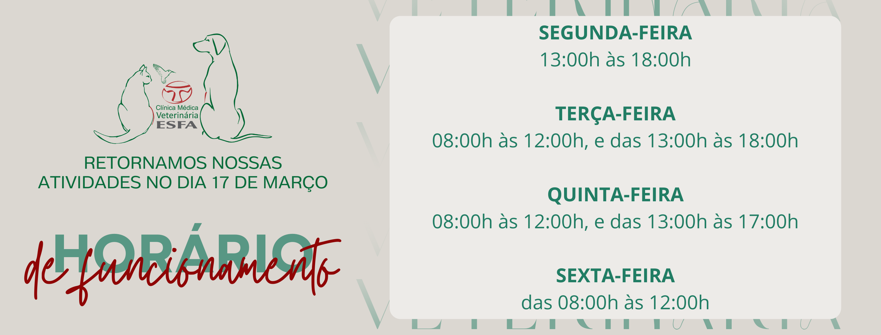 Para sua comodidade, a Clínica Veterinária da ESFA atenderá nos seguintes horários: