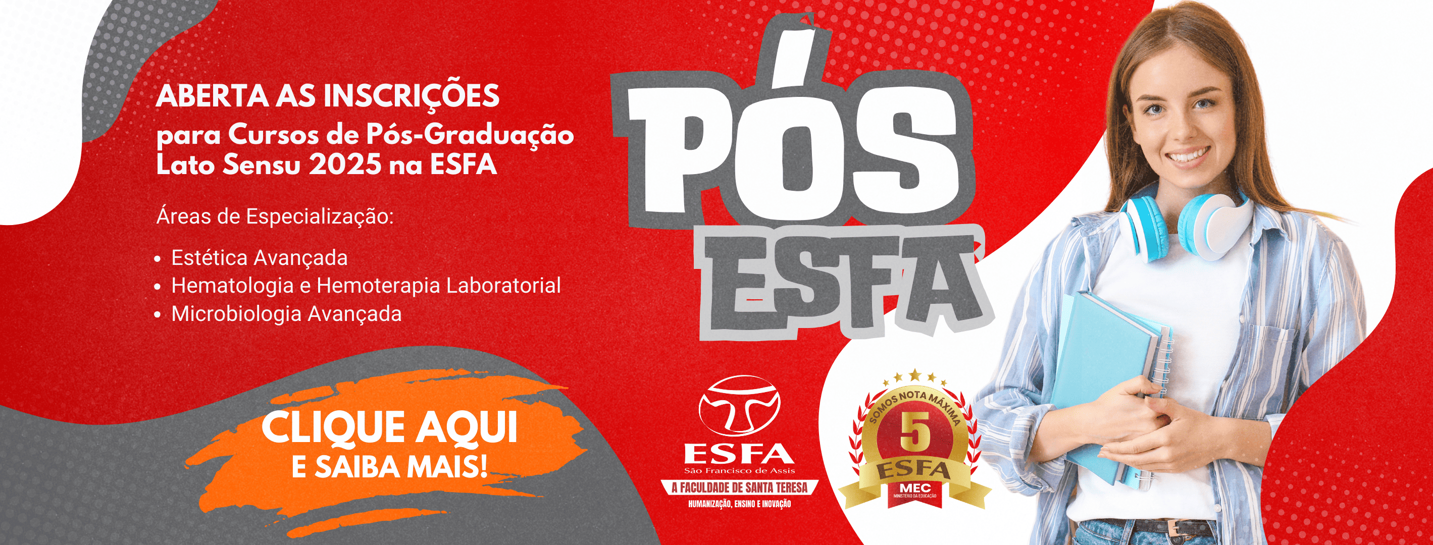 A ESFA, Faculdade de Santa Teresa–ES, por meio de seu Diretor-Geral, Edcarlos Mário Hoffmann, divulga a abertura das inscrições para os cursos de Pós-Graduação Lato Sensu, referente ao semestre 2025/1.