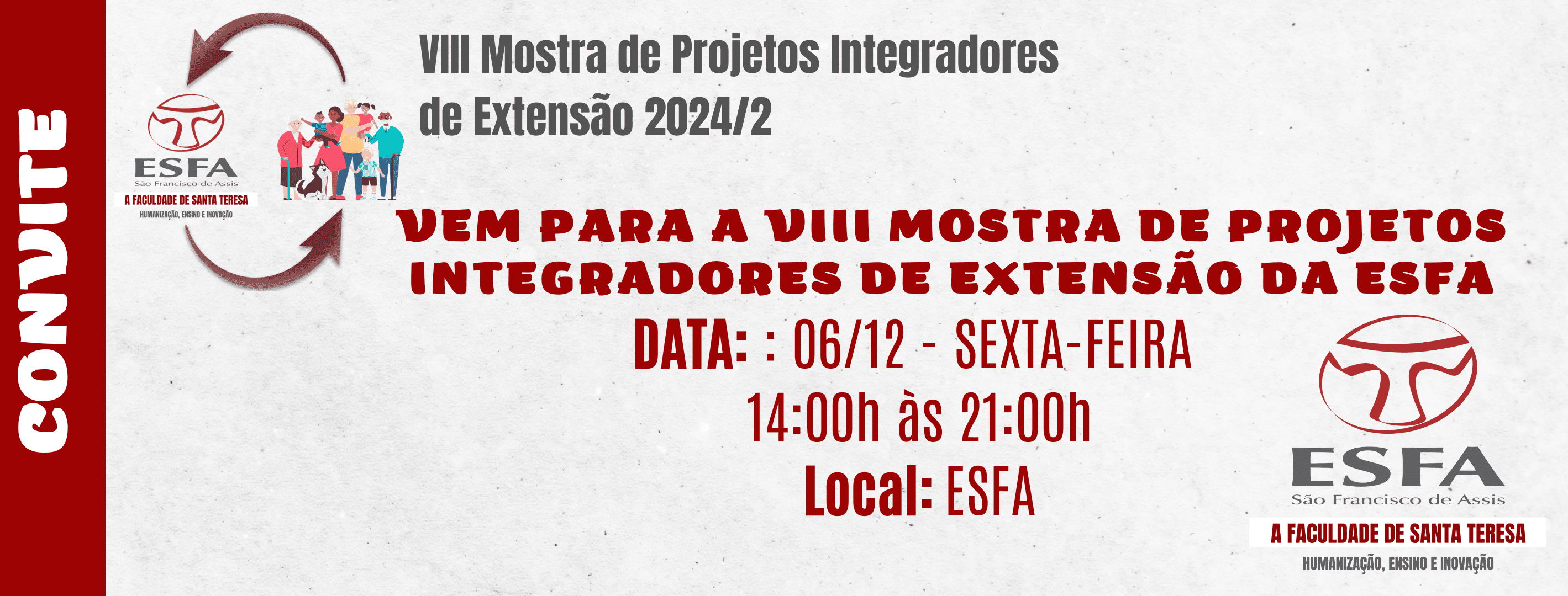 Prepare-se para um evento imperdível! Nesta sexta-feira (06), a Faculdade ESFA convida você para a VIII Mostra de Projetos Integradores de Extensão. Este é o palco onde a criatividade e o conhecimento se encontram, oferecendo uma experiência única de aprendizado e descoberta.
