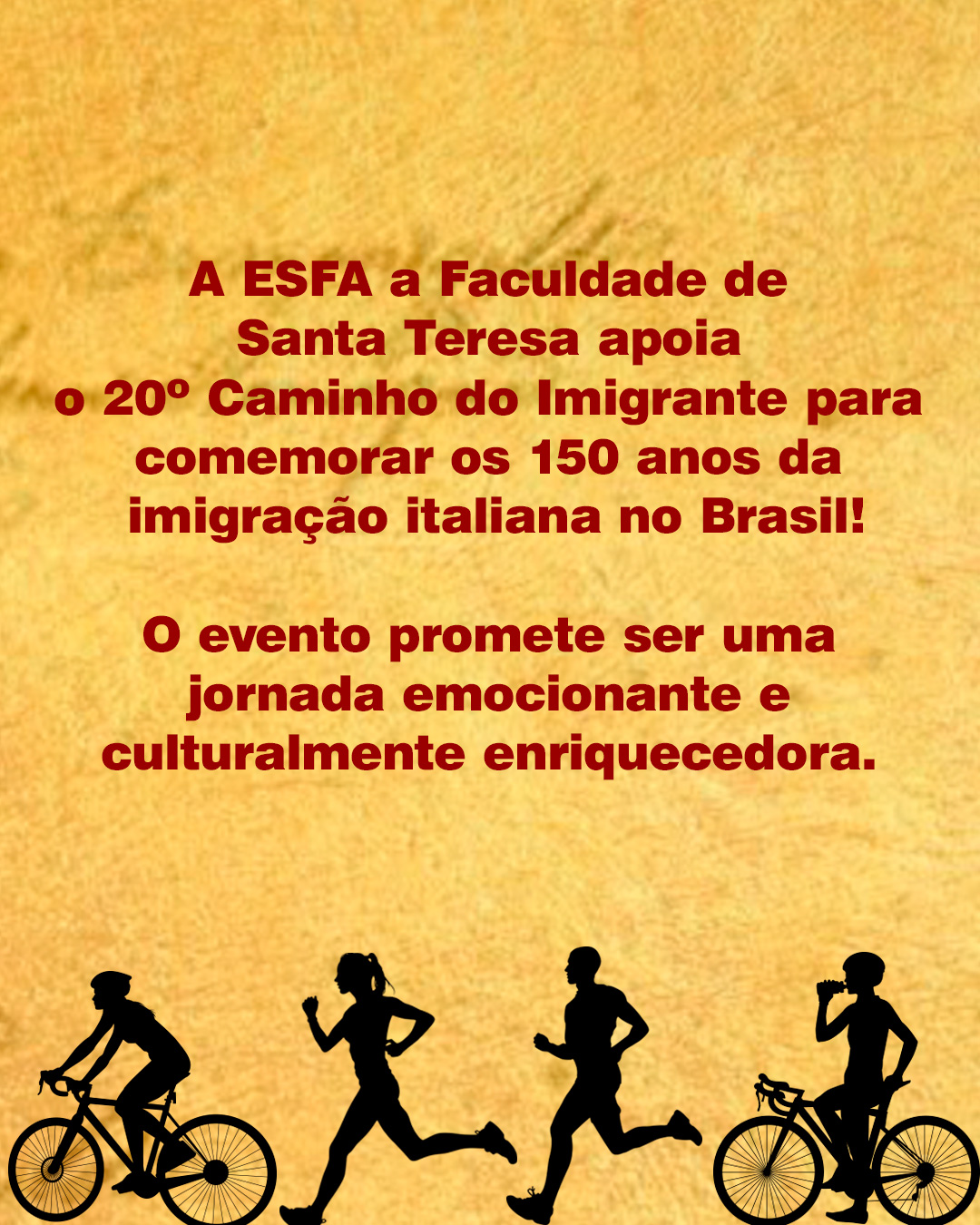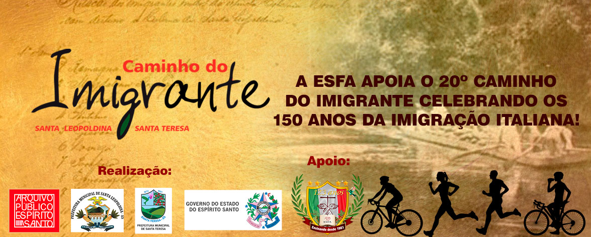 Organizado pelas prefeituras de Santa Teresa e Santa Leopoldina, com o apoio do Arquivo Público do Estado do Espírito Santo (APEES), o Caminho do Imigrante é uma celebração das raízes italianas que moldaram a região. Este ano, a ESFA contribuirá com placas de sinalização ao longo do percurso; oferecendo mensagens de incentivo e indicando a quilometragem da estrada. Ao chegarem no Parque de Exposições de Santa Teresa, os participantes encontrarão um local especial para registrar sua chegada após a longa caminhada, celebrando a vitória e o espírito de comunidade que permeia o Caminho do Imigrante.