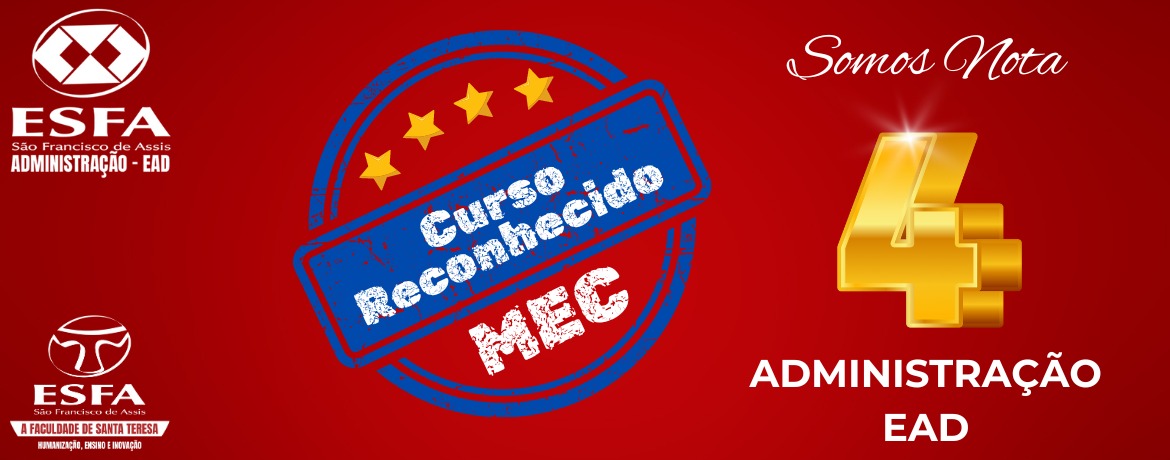 O curso de Administração na modalidade a distância (EaD) da ESFA, Faculdade de Santa Teresa, foi reconhecido, por meio de portaria divulgada pelo Ministério da Educação (MEC), com nota 4 (em uma escala que vai de 0 a 5).