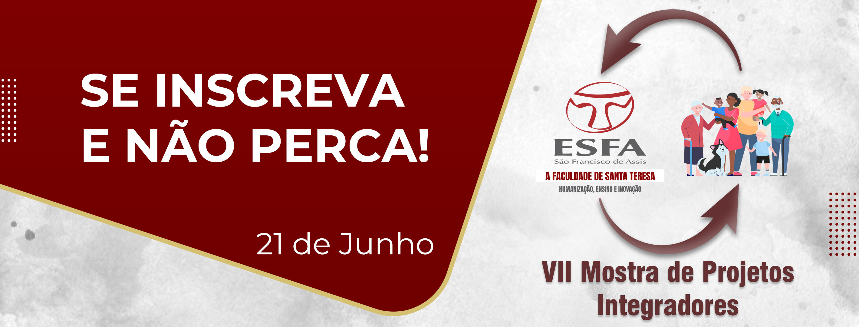 A Escola Superior São Francisco de Assis (ESFA) tem o prazer de convidar a comunidade para a VII Mostra de Projetos Integradores de Extensão, agendada para o dia 21 de Junho de 2024 em sua sede na cidade de Santa Teresa, ES. Este evento representa uma oportunidade única para testemunhar o talento e a dedicação dos alunos da ESFA em resolver desafios do mundo real através da integração de conhecimentos adquiridos durante seus estudos.