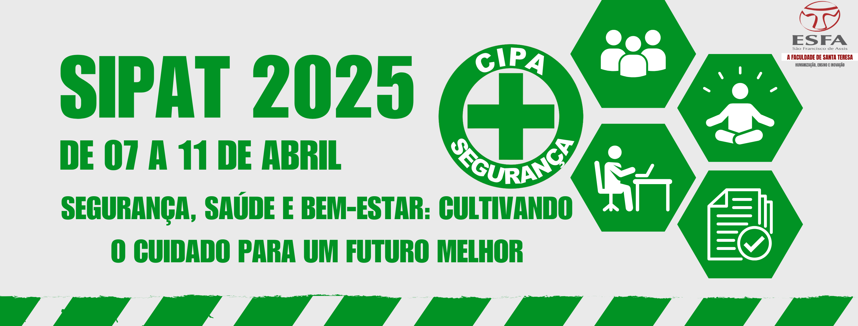 A ESFA convida todos os seus colaboradores para participar da Semana Interna de Prevenção de Acidentes do Trabalho (SIPAT), que acontecerá de 9 a 11 de abril de 2025. Com o slogan “Segurança, Saúde e Bem-Estar: Cultivando Cuidado para um Futuro Melhor”, o evento visa promover a conscientização sobre a importância da saúde e segurança no ambiente de trabalho, além de oferecer uma programação diversificada, com minicursos, palestras e atividades interativas.