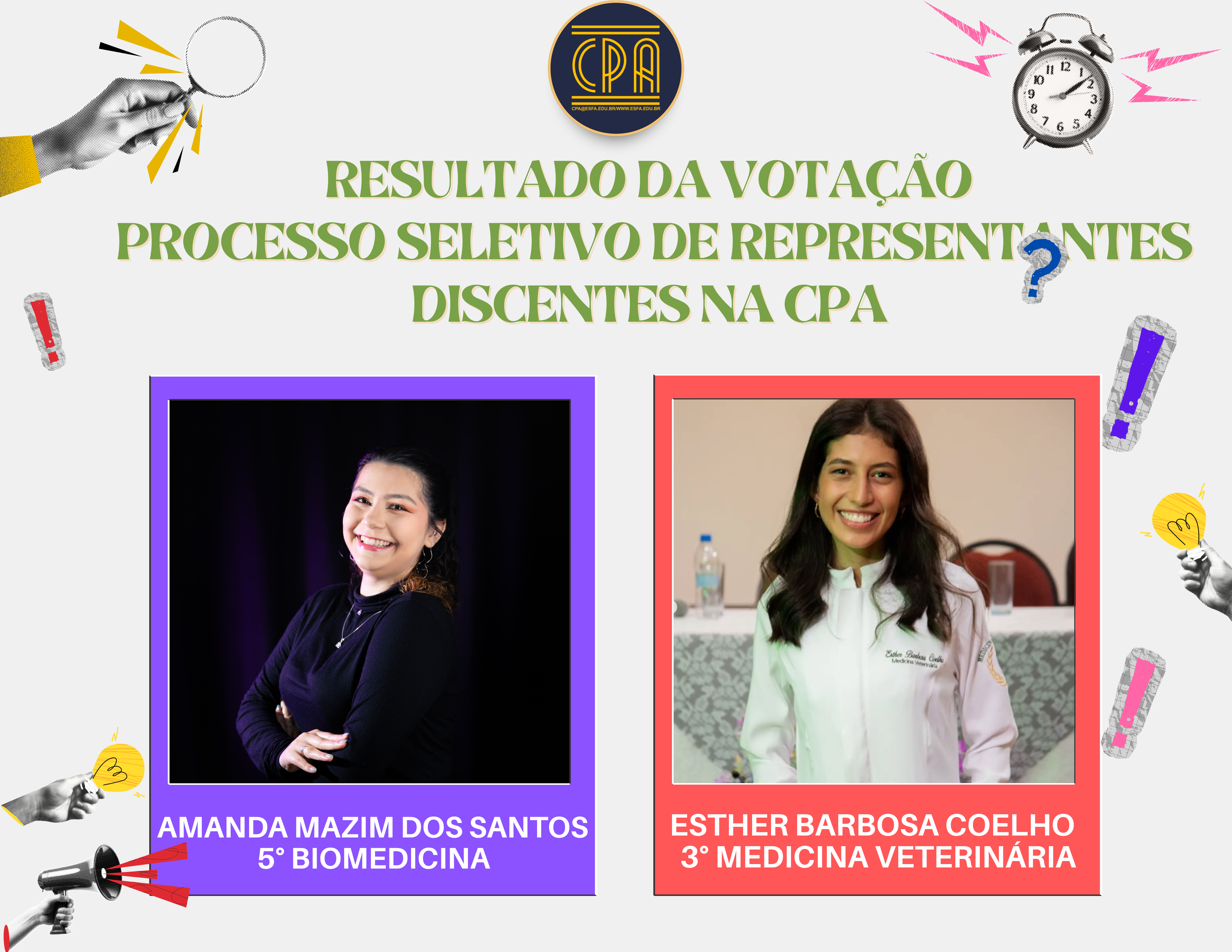 É com alegria que anunciamos as estudantes eleitas para representar os discentes na CPA (Comissão Própria de Avaliação) da ESFA: